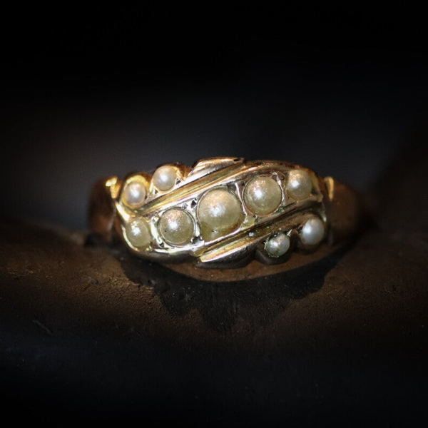 Deze elegante antieke ring, vervaardigd in 1896 in Birmingham, Verenigd Koninkrijk en ingekocht in Kaapstad in Zuid-Afrika is een charmant stukje geschiedenis. Je kunt je voorstellen wat een reis deze ring heeft afgelegd in die tijd. De verfijnde parels die de ring sieren, waren tijdens de Victoriaanse periode populair en symboliseerden vaak zuiverheid en onschuld. In het jaar 1896 bevond de wereld zich in de late Victoriaanse tijd, een tijdperk dat bekend stond om zijn overvloedige sieraden en kunstzinnige ontwerpen, wat deze ring een waardevol historisch juweel maakt.