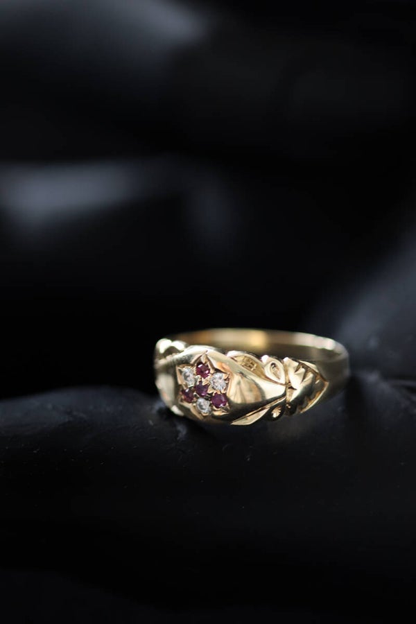 Deze prachtige pre-loved 9k gouden gypsy ring met een betoverende robijn en sprankelende diamanten is een uniek en tijdloos stuk dat al een verhaal te vertellen heeft. In de oudheid werden robijnen gezien als symbolen van passie en kracht, terwijl diamanten symbool stonden voor eeuwige liefde en onverwoestbaarheid.