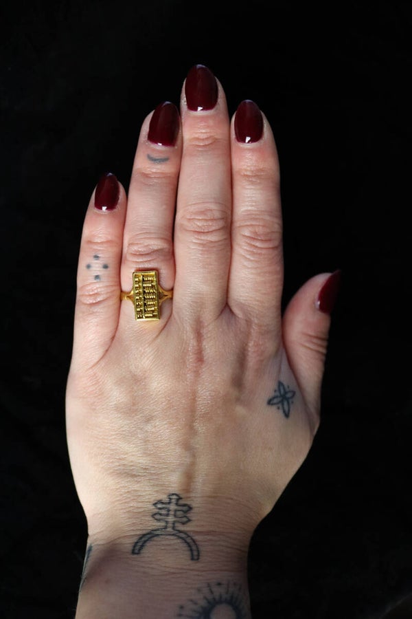 Deze ring gemaakt van 24 karaat puur goud staat symbool voor rijkdom, handel en succes. Het telraam (abacus) werd in de oudheid al gebruikt door handelaren vanuit alle hoeken van de wereld om handel te kunnen drijven door gemakkelijk te rekenen.