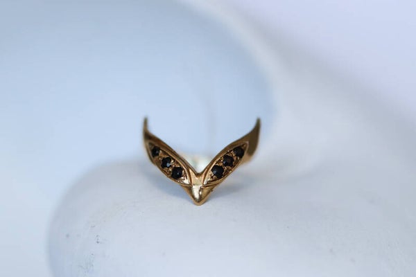 Deze vintage 9k Wishbone ring, bezet met heldere saffieren, is een prachtig voorbeeld van tijdloos ontwerp en verfijning. Saffieren werden in de oudheid al gewaardeerd om hun symboliek van wijsheid, trouw en bescherming, en werden vaak gedragen door koningen en aristocraten. In de Victoriaanse tijd werd de saffier beschouwd als een steen die de drager geluk en stabiliteit bracht, wat deze ring niet alleen esthetisch aantrekkelijk maar ook vol betekenis maakt.