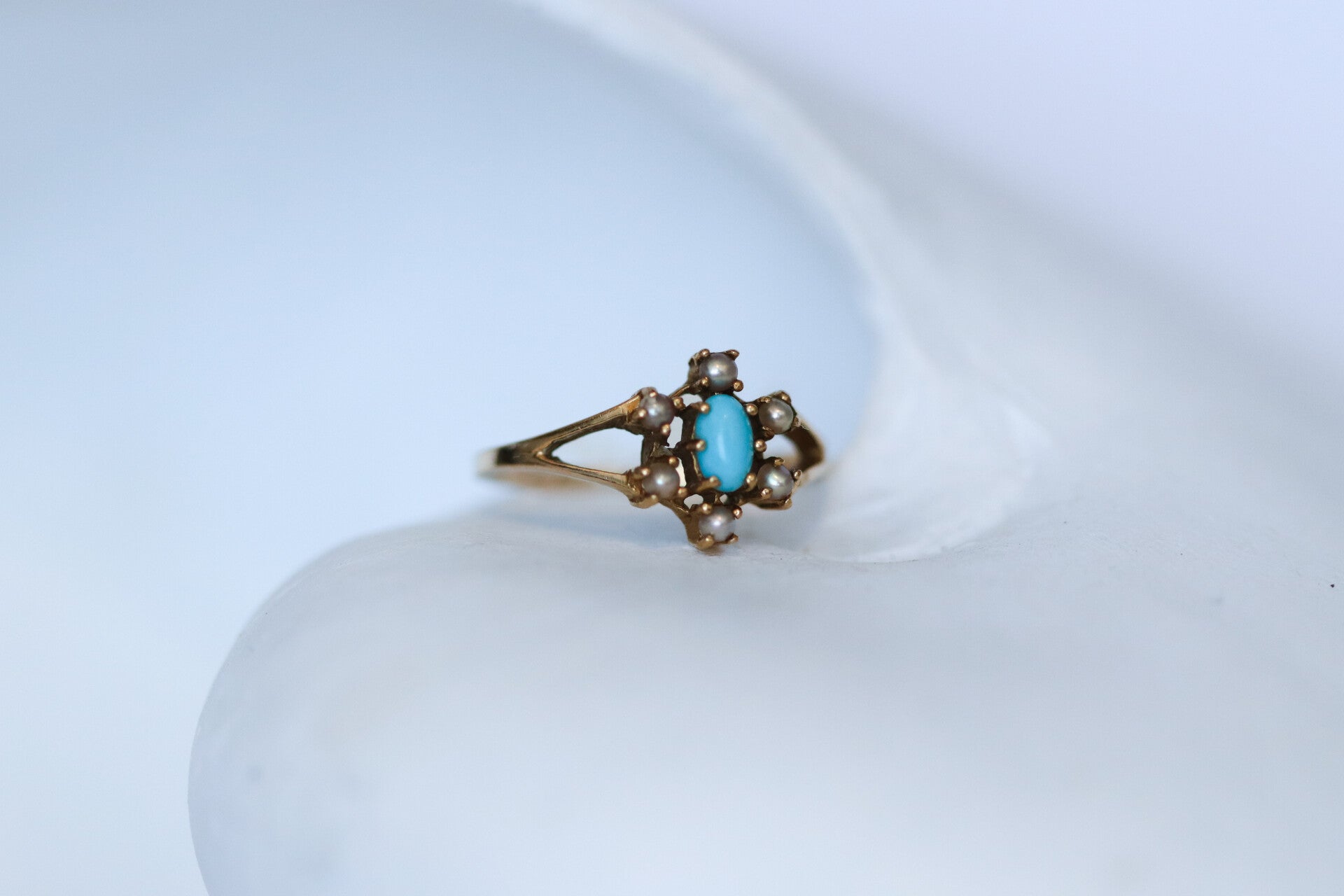 Deze vintage 9k ring, bezet met een levendig turkoois en omgeven door parels, is een prachtig voorbeeld van tijdloze elegantie. Turkoois werd al in de oudheid gewaardeerd door de Romeinen, die het beschouwden als een beschermende steen die geluk en kracht bracht, en droegen het vaak als talisman. Parels werden in de Romeinse tijd gezien als symbolen van puurheid en status, wat deze ring een verfijnde historische betekenis en een tijdloze charme geeft.