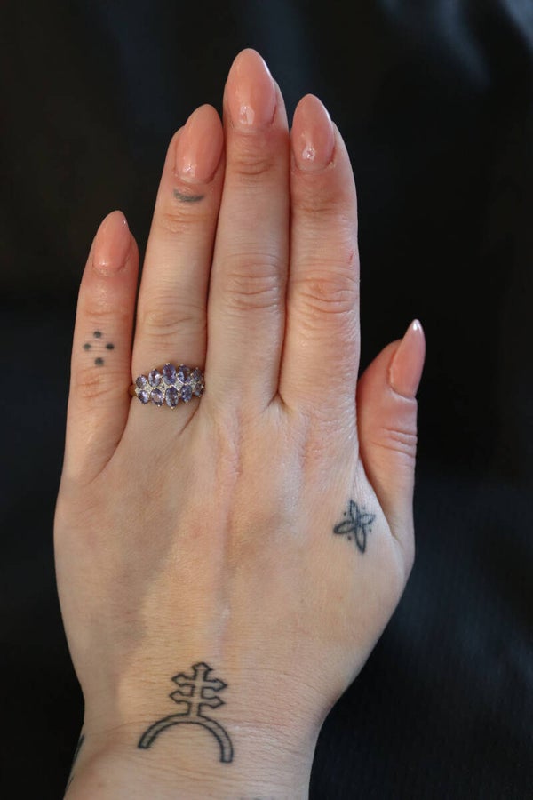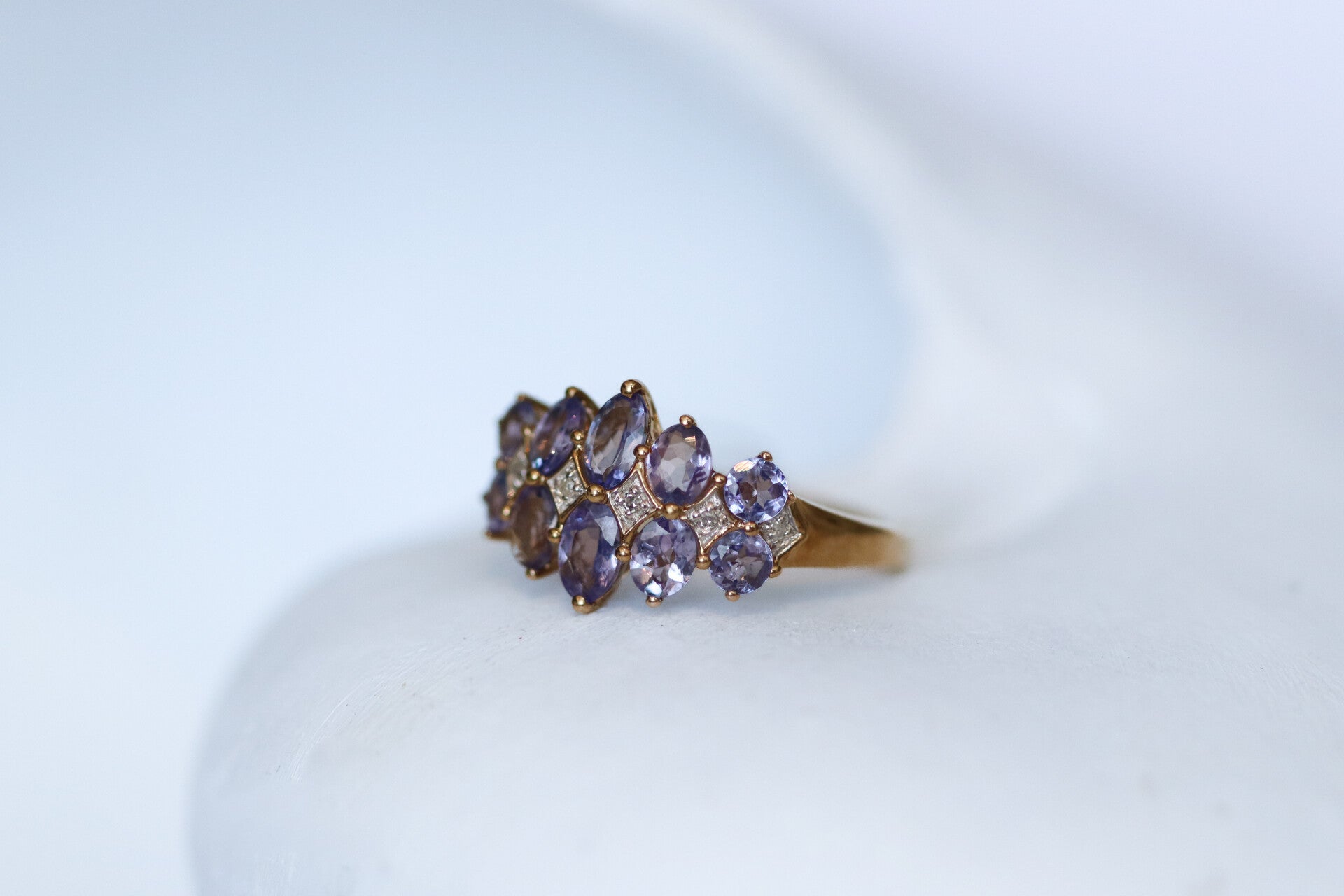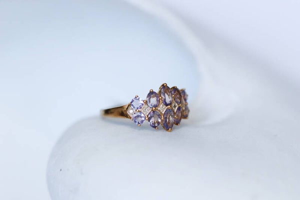 Deze vintage 9k ring, bezet met prachtige iolieten en sprankelende diamanten, combineert tijdloze elegantie met een rijke geschiedenis. Ioliet, ook wel de "water saffier" genoemd, werd in de oudheid door de Vikingen gebruikt als navigatiehulp, omdat het hen hielp de richting van de zon te bepalen tijdens verre reizen. Diamanten, symbolen van onvoorwaardelijke liefde en onbreekbare kracht, waren al in de 19e eeuw een populaire keuze voor sieraden, wat deze ring een bijzonder historische en emotionele betekenis geeft.
