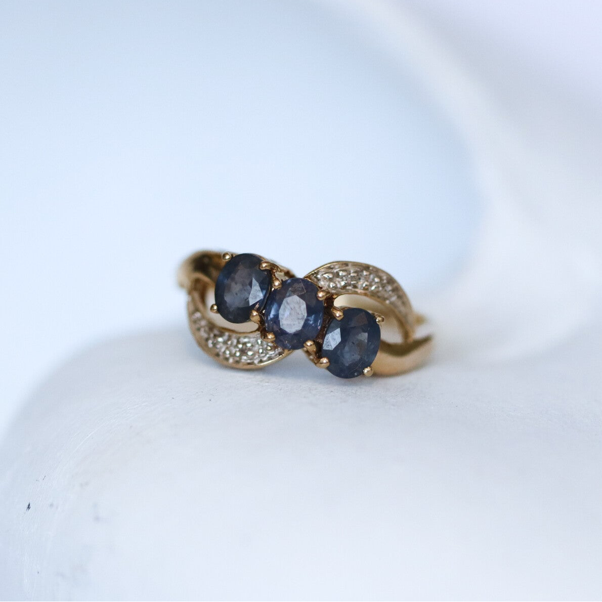 Deze vintage 9k ring, bezet met prachtige iolieten en sprankelende diamanten, combineert tijdloze elegantie met een rijke geschiedenis. Ioliet, ook wel de "water saffier" genoemd, werd in de oudheid door de Vikingen gebruikt als navigatiehulp, omdat het hen hielp de richting van de zon te bepalen tijdens verre reizen. Diamanten, symbolen van onvoorwaardelijke liefde en onbreekbare kracht, waren al in de 19e eeuw een populaire keuze voor sieraden, wat deze ring een bijzonder historische en emotionele betekenis geeft.