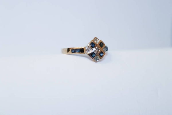 Een verfijnde vintage ring met een uniek ruitvormig design, bezet met diepblauwe saffieren en sprankelende diamantjes. De combinatie van de geometrische vormen en het warme geelgoud zorgt voor een subtiele balans tussen klassiek en speels.