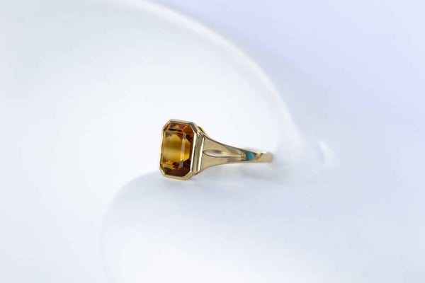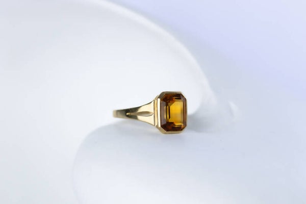 Deze vintage 9 karaat ring heeft een rechthoekig geslepen honingkleurige citrien als middelpunt. De warme, amberachtige tint van de steen sluit naadloos aan bij het goud, wat de ring een harmonieuze uitstraling geeft. Citrien wordt geassocieerd met vreugde, vitaliteit en overvloed — volgens de traditie zou hij positieve energie aantrekken en zelfvertrouwen versterken.