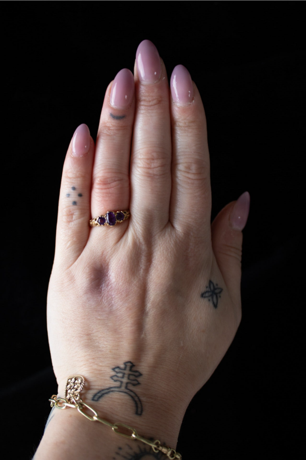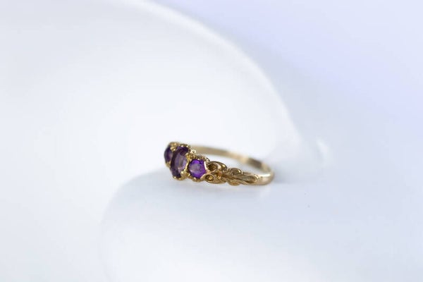 Deze vintage 9 karaat ring heeft drie ovaalgeslepen amethisten, gezet in een sierlijke Art Nouveau-stijl met organische details in het goud. De dieppaarse tint van de stenen komt prachtig tot zijn recht in het warme metaal. Amethist werd in de Art Nouveau-periode vaak gebruikt vanwege haar spirituele betekenis — ze staat symbool voor innerlijke rust, zuiverheid en intuïtie.