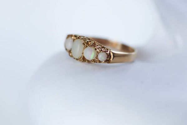 Deze vintage ring heeft een klassiek en elegant ontwerp met een rij zachte opalen die subtiel in grootte oplopen. De opalen tonen een licht spel van iriserende kleuren dat verandert met het licht. De verfijnde details in de zetting geven de ring een romantische uitstraling en maken het een tijdloos stuk voor liefhebbers van vintage sieraden.