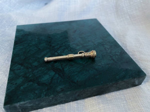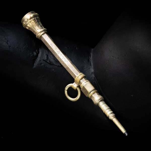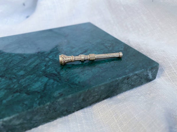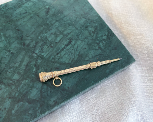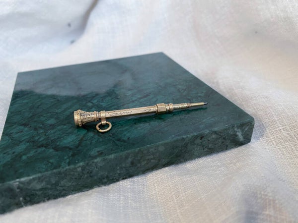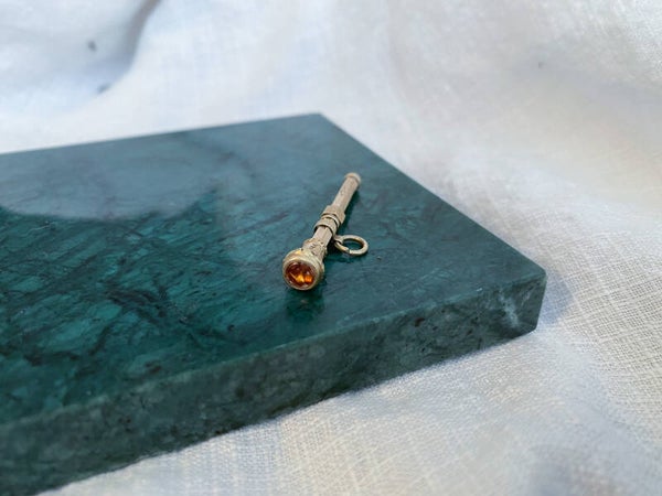 Deze antieke 9k propelling pencil hanger met citrien is een uniek stuk uit de Victoriaanse periode. De propelling pencil, die dienst doet als hanger, heeft een mechanisme dat het potlood kan verlengen en intrekken door de hanger uit te schuiven.