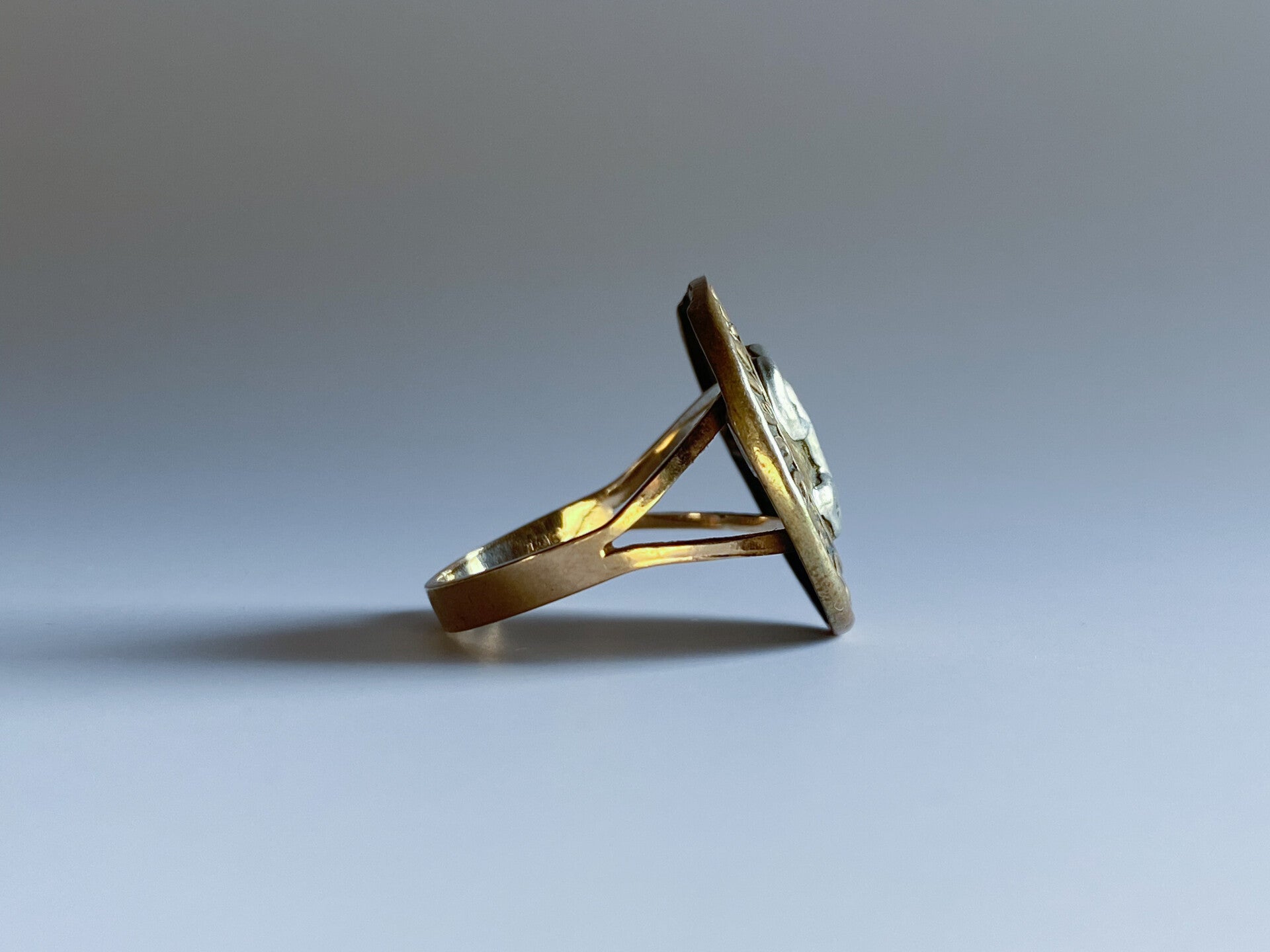 Deze prachtige 9k ring is bezet met wat waarschijnlijk een insigne is geweest van een officier van de 7th Queen's own hussars. Zie de laatste foto om te zien hoe de insigne er uit heeft gezien. Dit was een Cavalerie eenheid die is opgericht in 1689. Er zijn hele boeken geschreven over heldhaftige verhalen van deze eenheid en deze ring is natuurlijk een prachtig stukje geschiedenis.