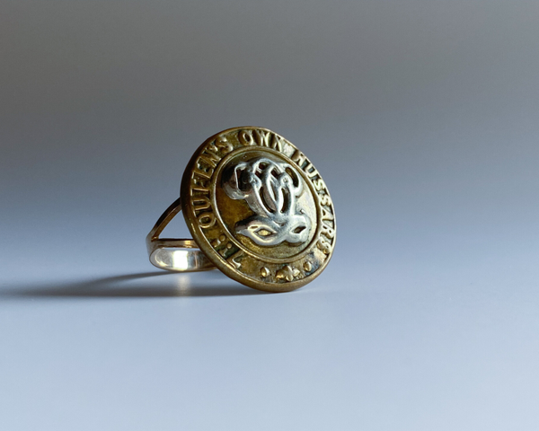 Deze prachtige 9k ring is bezet met wat waarschijnlijk een insigne is geweest van een officier van de 7th Queen's own hussars. Zie de laatste foto om te zien hoe de insigne er uit heeft gezien. Dit was een Cavalerie eenheid die is opgericht in 1689. Er zijn hele boeken geschreven over heldhaftige verhalen van deze eenheid en deze ring is natuurlijk een prachtig stukje geschiedenis.