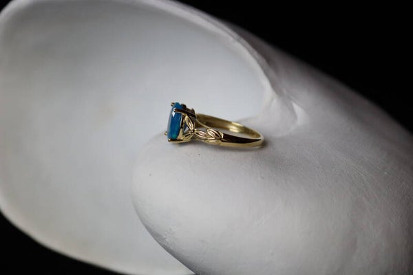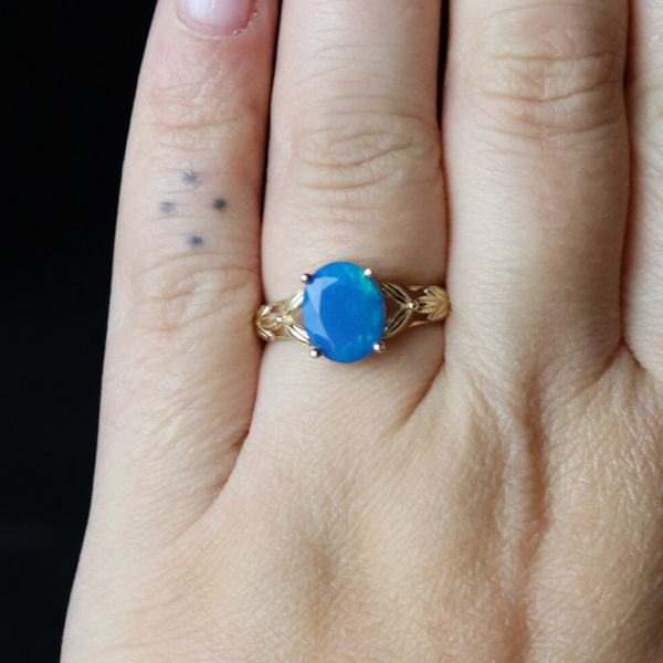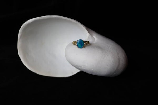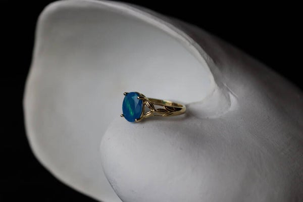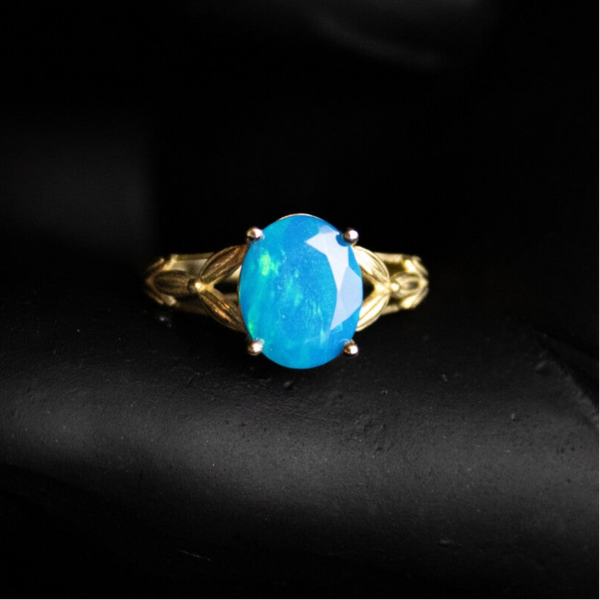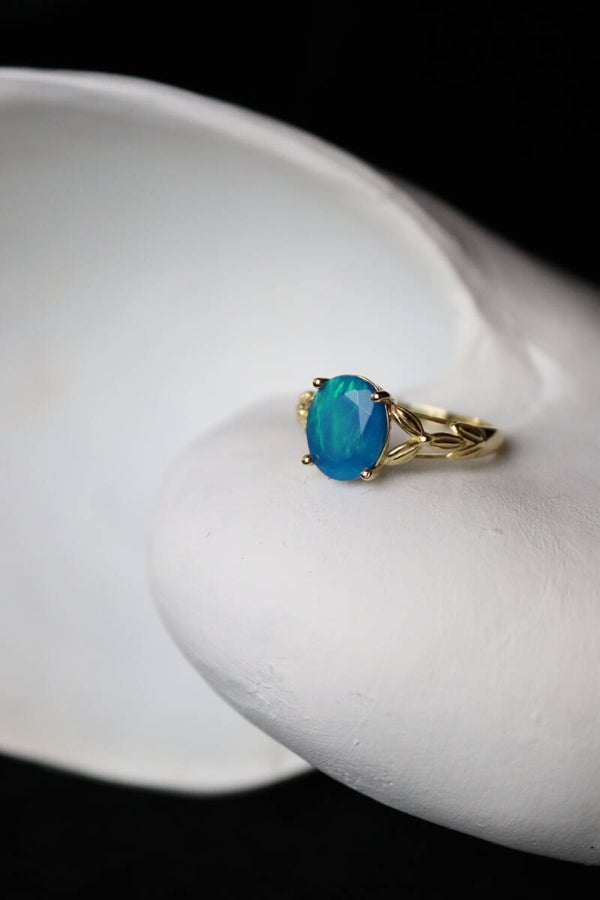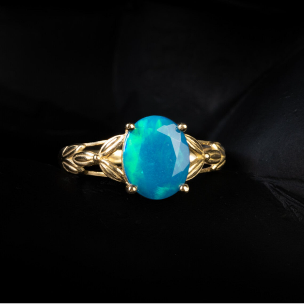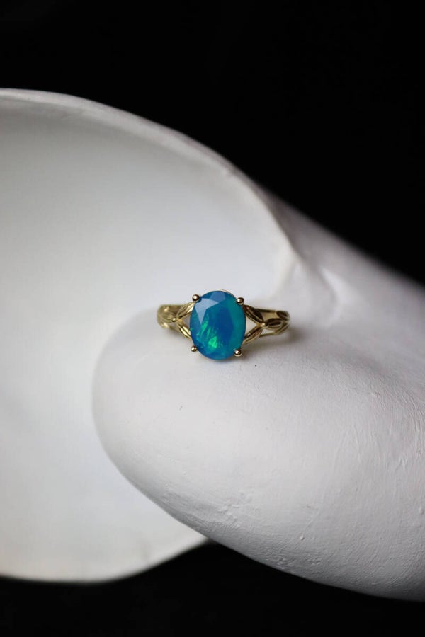 Deze 9k ring is bezet met een sprankelende blauwe opaal. Er zitten veel groene, blauwe en turkooisen flashes in de steen. Opaal is een edelsteen die al sinds de oudheid wordt gebruikt en werd beschouwd als een symbool van hoop, loyaliteit en creativiteit. In de 19e eeuw werd opaal erg populair bij kunstenaars en schrijvers vanwege de veronderstelde inspirerende en creatieve eigenschappen.