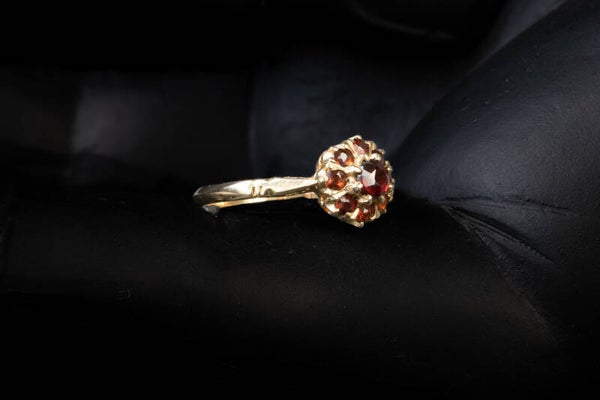 Een treasure die uit het hart van een rozentuin lijkt te zijn geplukt. De dieprode granaten gloeien als rozenblaadjes en de gouden zetting schittert als zonnestralen door de bladeren.